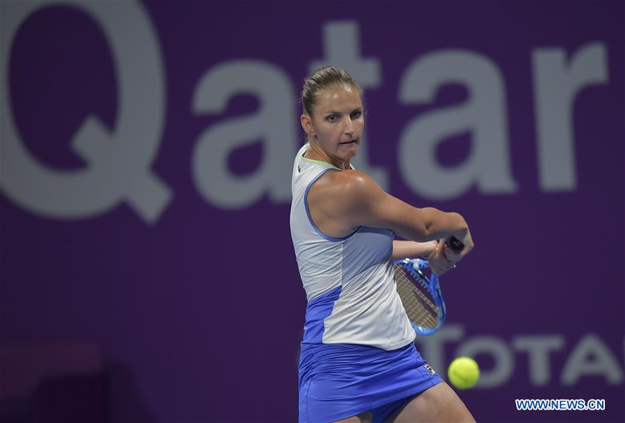 Karolina Pliskova of Czech Republic hits a return during the women's singles third round match against Ons Jabeur of Tunisia at the 2020 WTA Qatar Open in Doha, Qatar, Feb. 26, 2020. (Photo by Nikku/Xinhua)