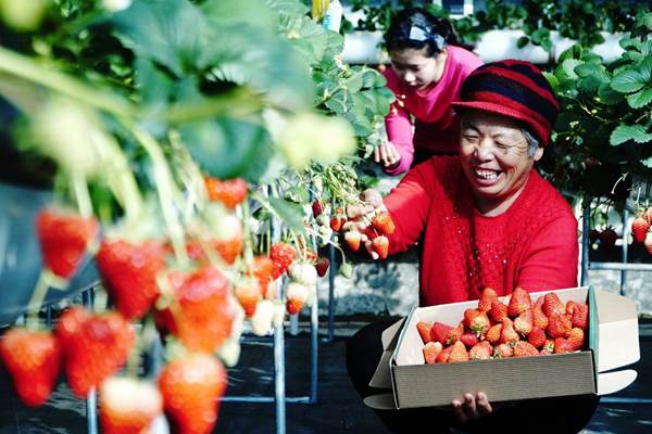 Farmers at Shilibu Town, Miyun District of Beijing, pick hot-sale strawberries for online pre-order. (Photo by He Yong from People’s Daily)