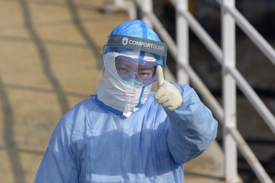 A medical worker gestures at Huoshenshan (Fire God Mountain) Hospital in Wuhan, central China's Hubei Province, Feb. 4, 2020. (Photo by Fan Xianhai/Xinhua)