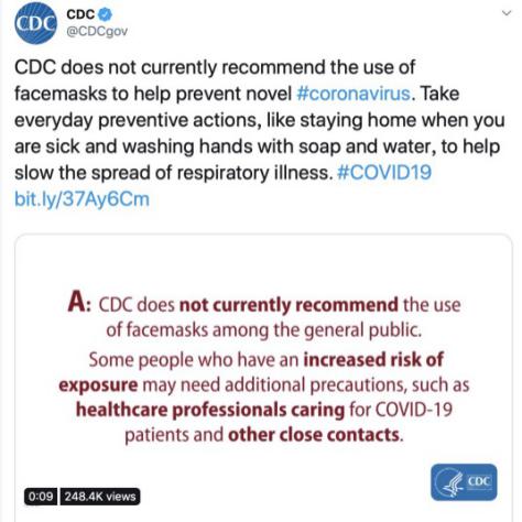 On Feb. 28, the CDC released a video on its official Twitter account entitled “COVID-19: Should I wear a mask?”, in which the CDC doesn’t currently recommend the use of face masks among the general public to protect against COVID-19. “Some people who have an increased risk of exposure may need additional precautions, such as healthcare professionals caring for COVID-19 patients and other close contacts,” CDC states.