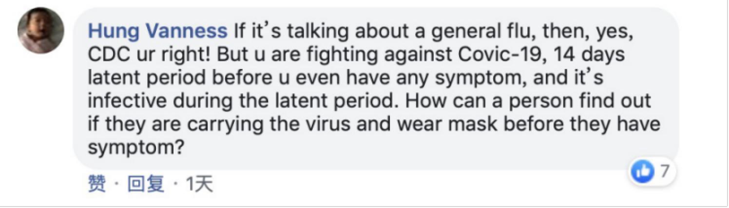 A Facebook user named Hung Vanness refuted the CDC’s advice by pointing out that COVID-19 has a maximum of 14 days of latency, and during this period patients may be completely asymptomatic, and furthermore that the virus has been confirmed by various health authorities to be contagious during the latent period, which makes it different from the general flu. “How can a person find out if they are carrying the virus and wear a mask before they have symptoms?” The user asked.