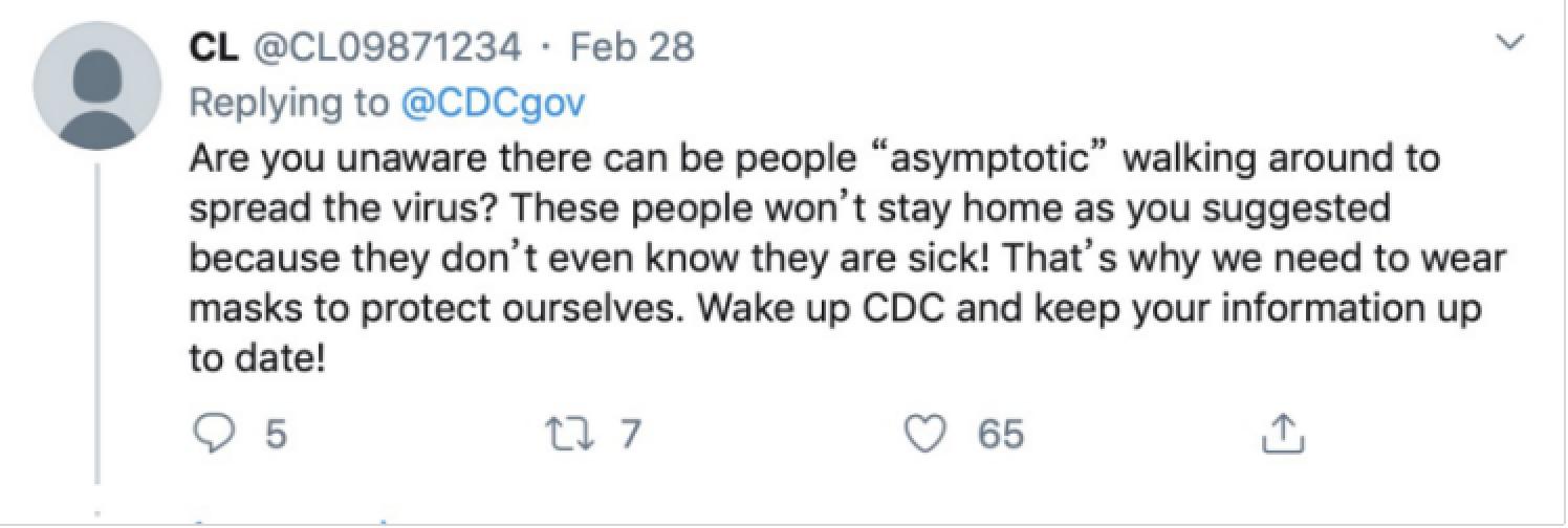 Echoing Vanness, another netizen, warned of the risks of asymptotic people spreading the virus. “These people won’t stay home, as you suggested because they don’t even know they are sick! ...Wake up CDC and keep your information up to date!”