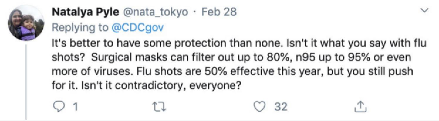 “Isn’t it what you say with flu shots? Surgical masks can filter out up to 80%, N95 up to 95% or even more of viruses. Flu shots are 50% effective this year, but you still push for it,” a Twitter user argued. “Isn't it contradictory, everyone?”