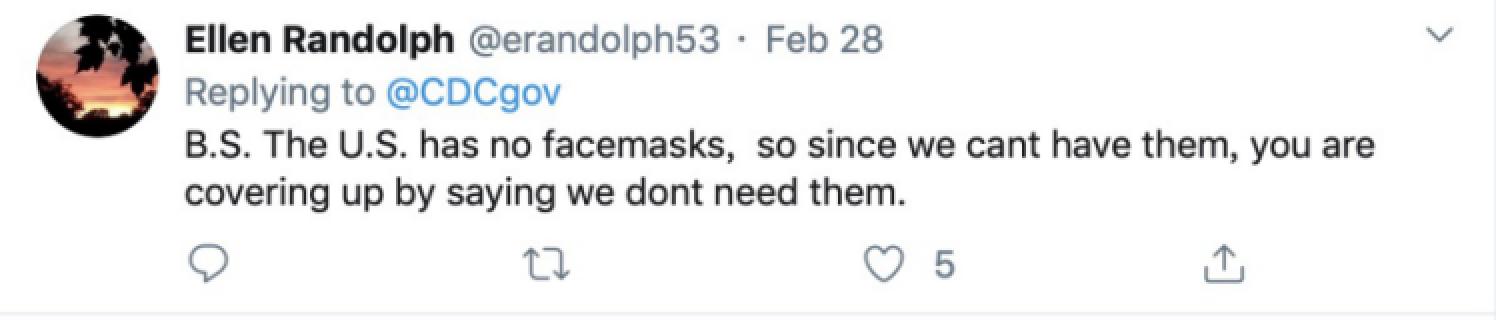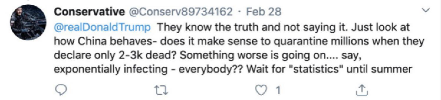 Some took China’s measures as an example to prove that face masks are necessary. A Twitter user with the screen name of Conservative said, “Just look at how China behaves. Does it make sense to quarantine millions when they declare only 2 to 3 thousand dead? Something worse is going on...”