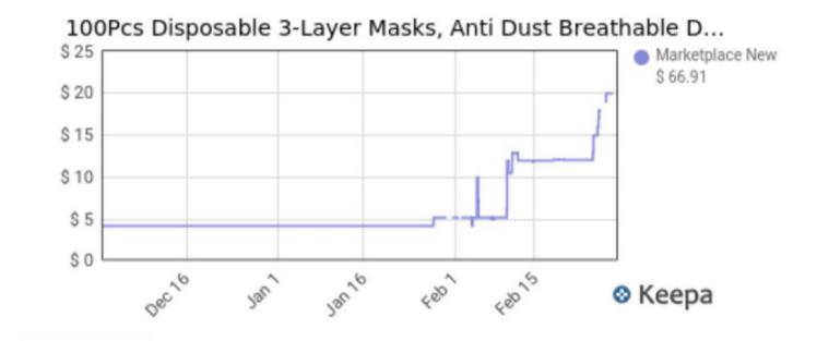 Some Amazon sellers have jacked up the face masks prices by four or five times what they cost only a few weeks before, according to Keepa, an Amazon price tracker.