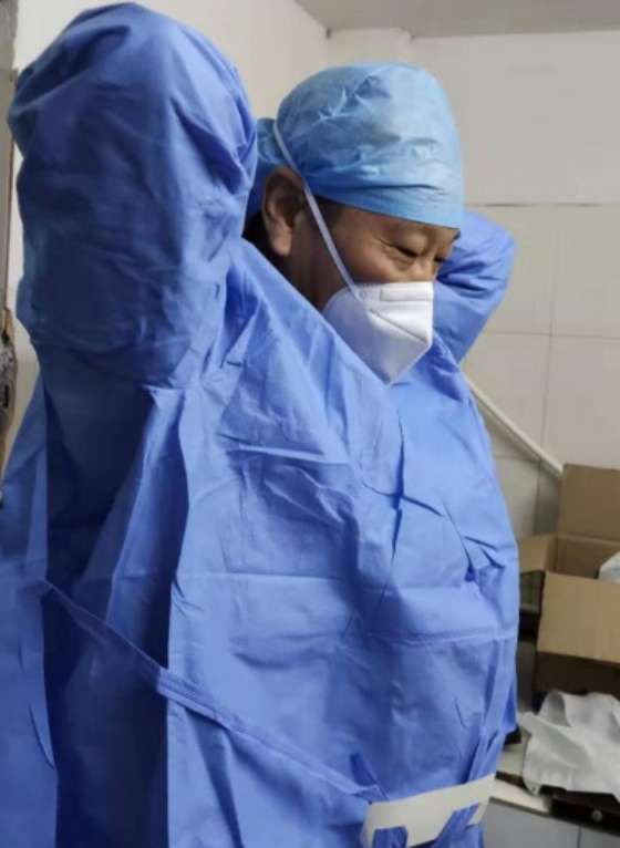 Wang gets out of bed, rushes to the hospital, puts together a spray disinfectant as quickly as he can, puts on a protective suit, and enters the operating room, where he begins applying the disinfectant.