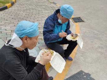 To prevent contamination in the office area, Wang and his colleagues, who frequently go in and out of high-risk areas, squat in a corner outside to take lunch.