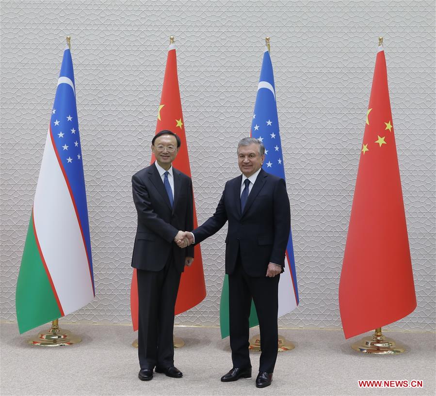 TASHKENT, March 2 (Xinhua) -- Uzbek President Shavkat Mirziyoyev met here on Monday with Yang Jiechi, a member of the Political Bureau of the Communist Party of China (CPC) Central Committee and director of the Office of the Foreign Affairs Commission of the CPC Central Committee, with both sides reaffirming commitment to strengthening ties.
