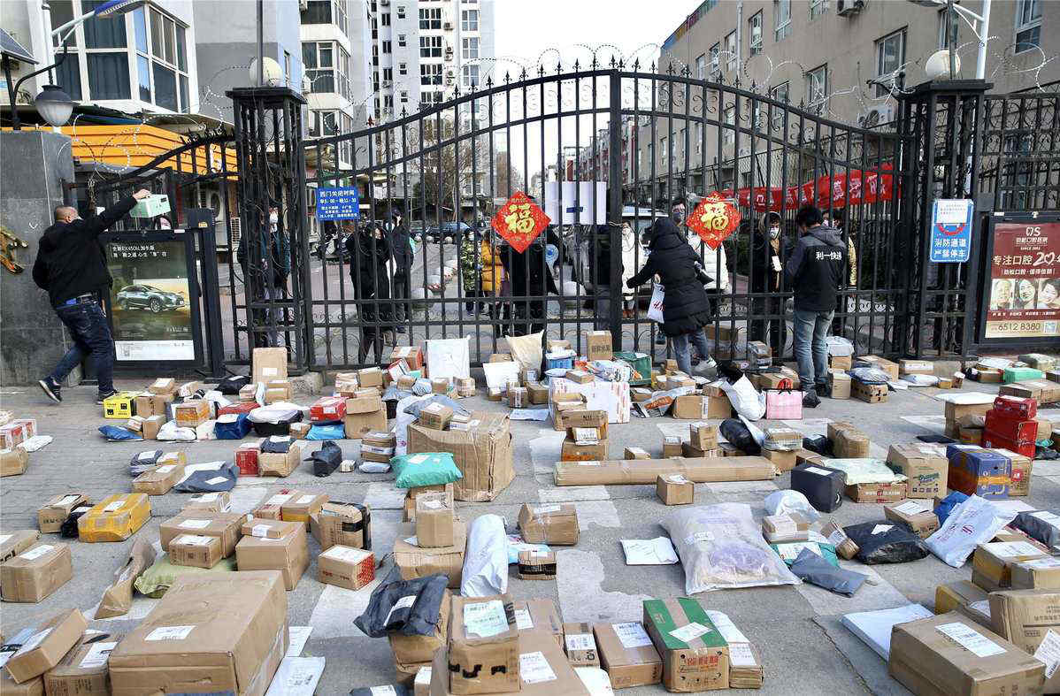 Delivery workers hand packages to residents through the gate of a community area as undelivered packages remain piled up at the gate in Chaoyang district of Beijing March 1, 2020. [Photo by Zou Hong/chinadaily.com.cn]