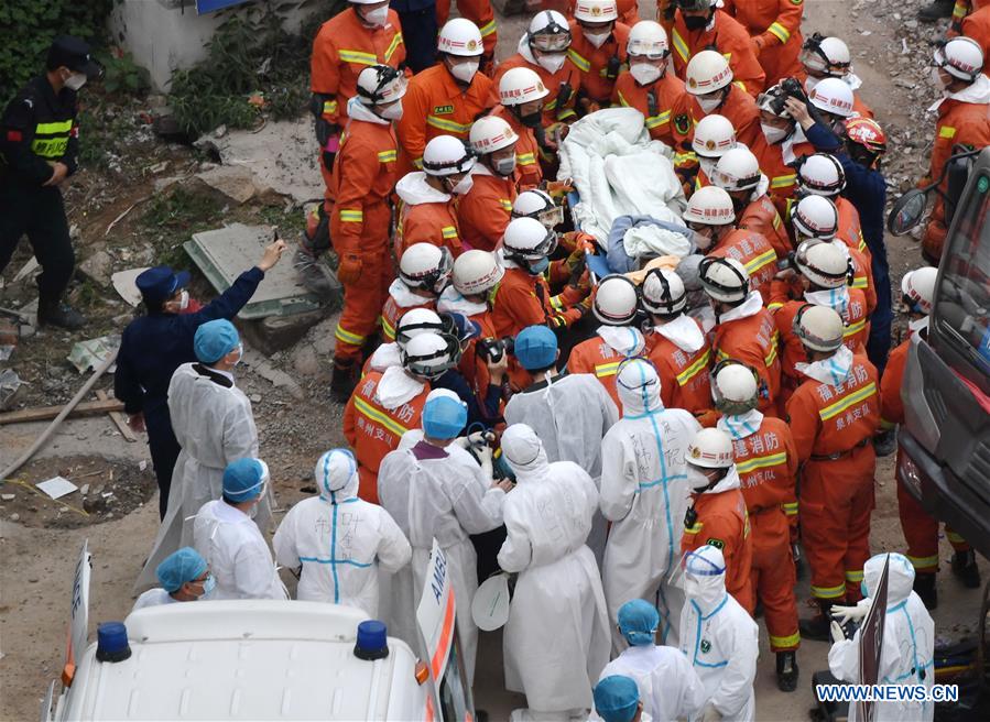 Rescuers transfer a man, who was trapped in the rubble for 69 hours, to an ambulance at the accident site of a hotel building collapse in Quanzhou, southeast China's Fujian Province, March 10, 2020. One man was rescued and sent to hospital at 4:37 p.m. Tuesday from a hotel building collapse in east China's Fujian Province on Saturday. The survivor was rescued 69 hours after being trapped in the rubble of the Xinjia Hotel in Licheng district in the city of Quanzhou. (Xinhua/Lin Shanchuan)