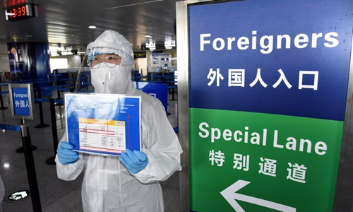 A staff member reminds foreigners to fill in an arrival card at Qingdao Liuting International Airport in Qingdao, east China's Shandong Province, March 5, 2020. Photo:Xinhua