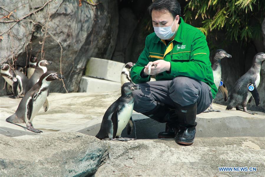 A breeder feeds penguins at Wuhan Zoo in Wuhan, central China's Hubei Province, March 7, 2020. Wuhan Zoo was closed on Jan. 22 after the novel coronavirus outbreak. Dozens of employees in the zoo have been sticking to their posts with feeding and disinfection work for nearly a thousand animals here. (Str/Xinhua)