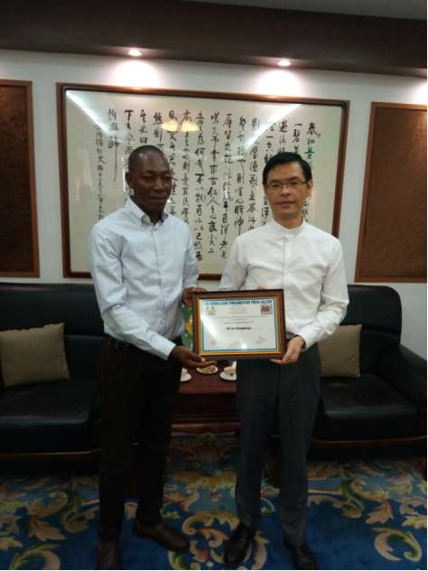 Ambassador Hu Zhangliang receives a certificate from the president of Sierra Leone’s Parliamentary Press Gallery, Hassan Y. Koroma