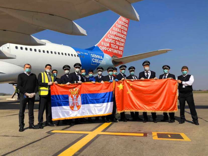 The cabin crew of the charter flight of Air Serbia pose for a picture with a Serbian and Chinese national flags on March 20, before they depart for Beijing to pick the Chinese experts and medical supplies donated by the Chinese government. (Photo courtesy of the official SNS account of the Chinese Embassy in Serbia)