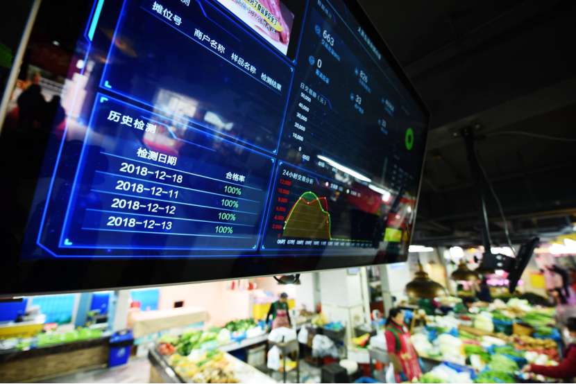 A vegetable mart in Hangzhou, east China’s Zhejiang province hangs a screen where sales data and test results of food safety are displayed, in an attempt to assure the consumers. Photo by Long Wei, People’s Daily Online