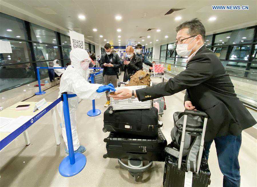 A staff member checks the information of a passenger entering China at the Pudong International Airport in Shanghai, east China, March 19, 2020. (Xinhua/Ding Ting)