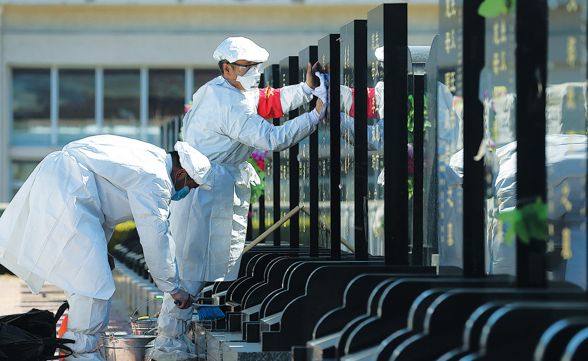 Cemetery workers clean headstones at the Babaoshan People's Cemetery in Beijing last month. During the coronavirus outbreak, the cemetery authorities are providing a tomb cleaning service to reduce visitor numbers. [WANG ZHUANGFEI/CHINA DAILY]