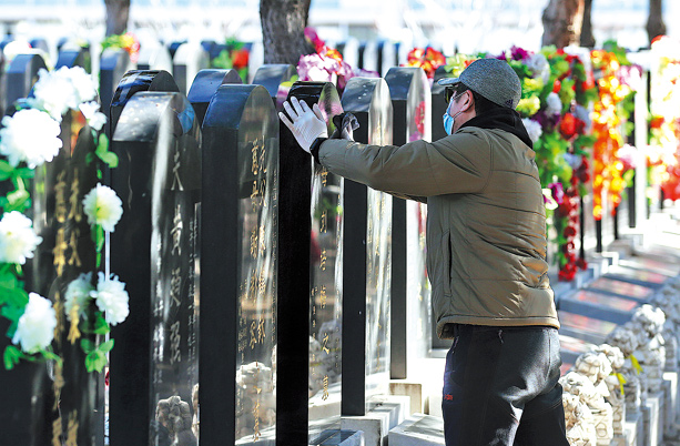 A man cleans a headstone. [WANG ZHUANGFEI/CHINA DAILY]