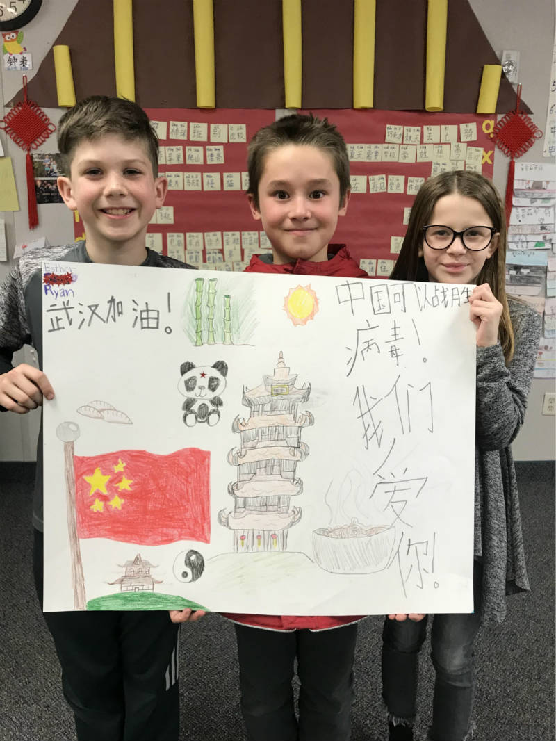 Cascade Elementary School students show their poster to cheer on China's fight against the novel coronavirus outbreak, in the town of Orem in the U.S. state of Utah, on Feb. 7, 2020. (Photo by Zheng Yamin/Xinhua)