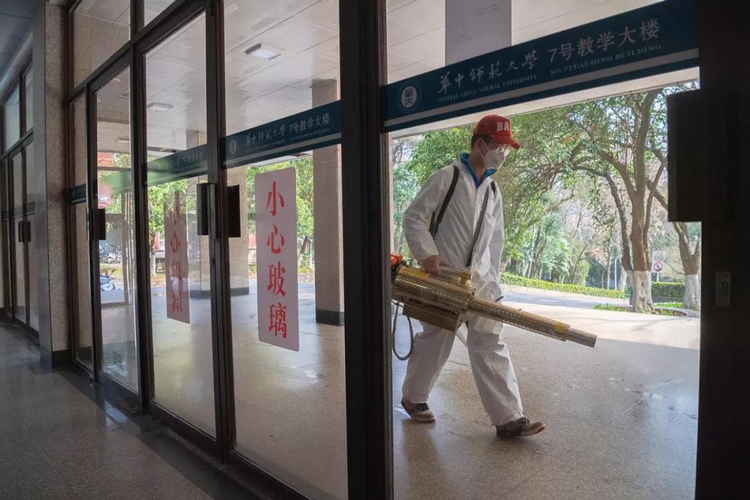 A staff member disinfects the teaching buildings at the Central China Normal University in Wuhan. (Photo/Chen Xichang)