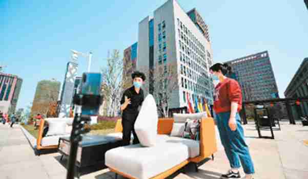 Photo taken in a cross-border e-commerce industrial park in Nankang district, Ganzhou, east China’s Jiangxi province shows sales clerk promotes furniture via live streaming on mobile phone. (Photo by Hu Chenhuan/Xinhua)