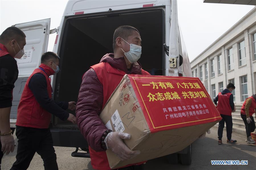 Volunteers transport supplies at a makeshift hospital converted from an office building, in Suifenhe, northeast China's Heilongjiang Province, April 14, 2020. The makeshift hospital in Suifenhe, a city at the China-Russia border in northeast China's Heilongjiang Province, will provide some 600 beds for patients. (Photo by Zhang Tao/Xinhua)