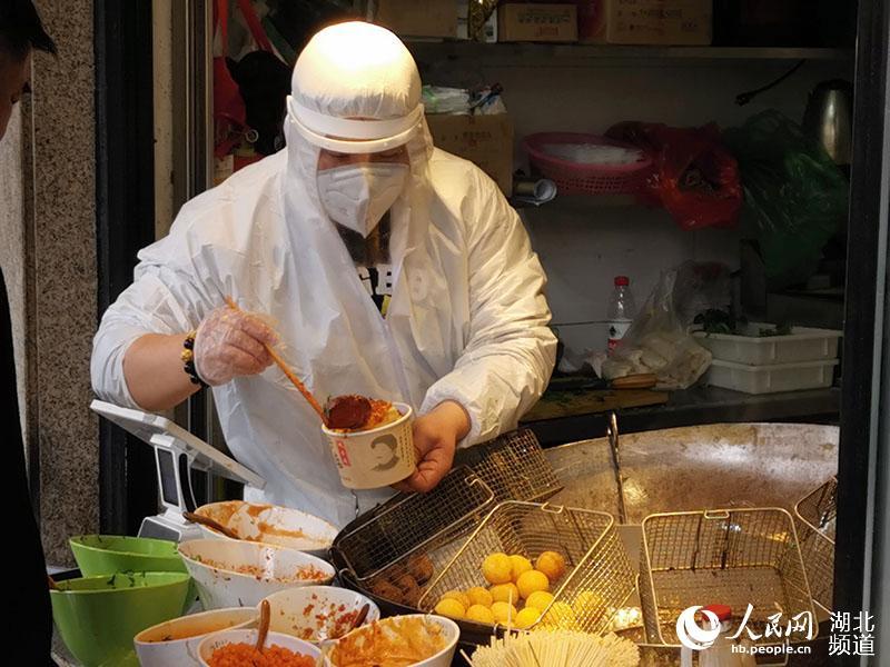 A worker fries stinky tofu in a protective suit. (Photo/Zhou Wen)