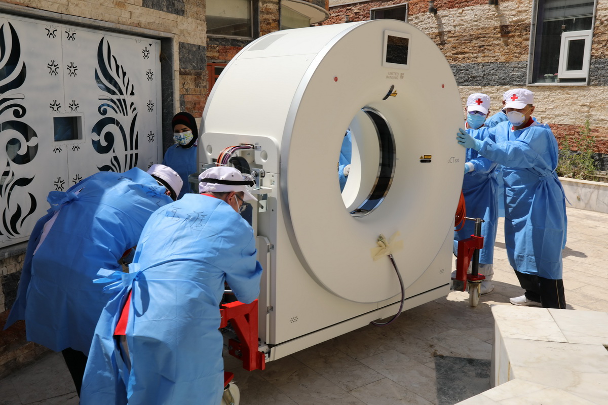 Members of the Chinese team move CT equipment in Baghdad, Iraq, April 12, 2020. (Xinhua/Zhang Miao)