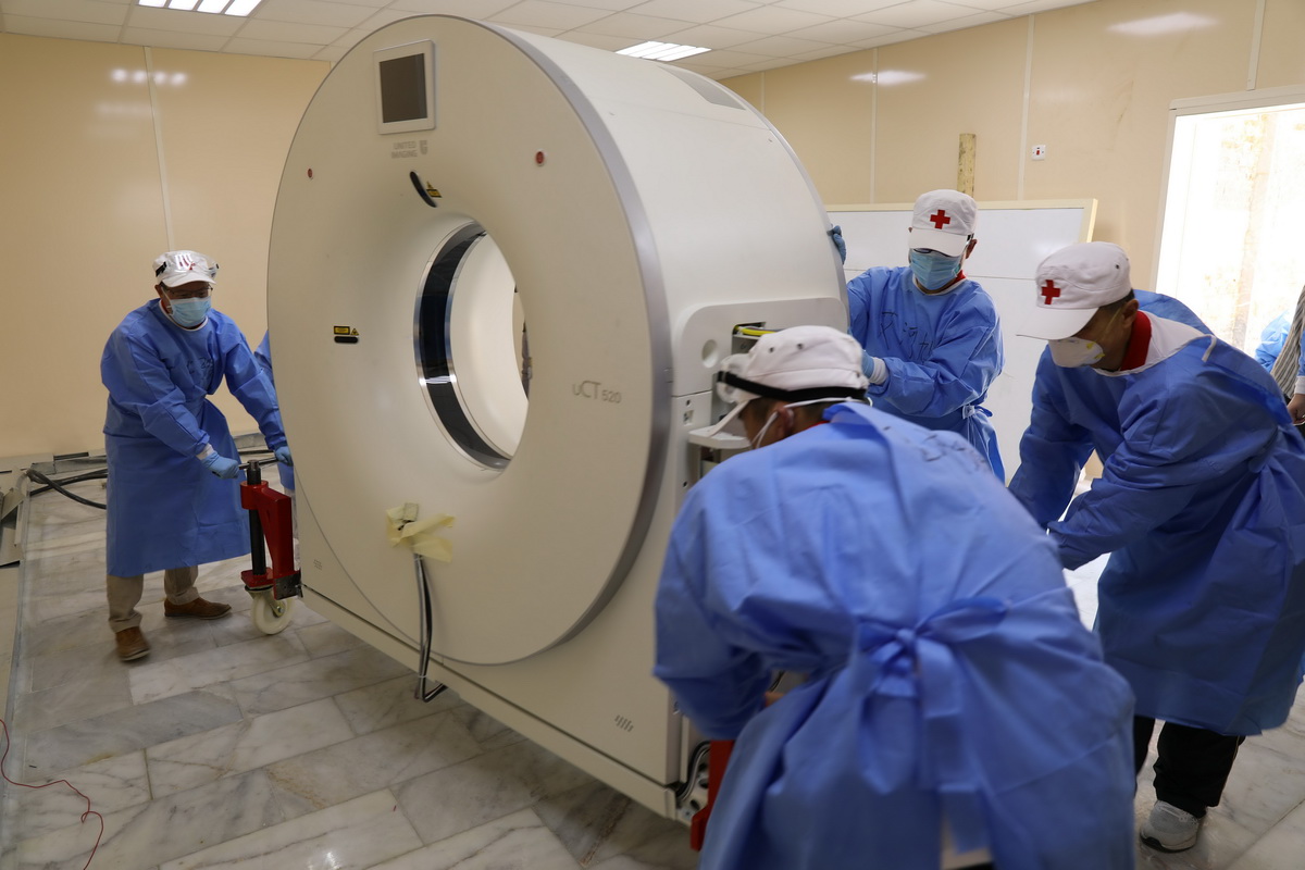 Members of the Chinese team move CT equipment in Baghdad, Iraq, April 12, 2020. (Xinhua/Zhang Miao)