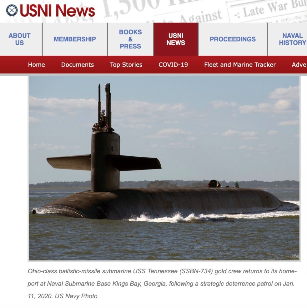 Public information about the USS Tennessee show that its crew returned to its homeport at Naval Submarine Base Kings Bay, following a strategic deterrence patrol on January 11, 2020.
