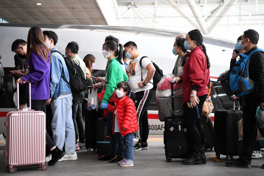 Passengers get off the high-speed train G1005 from Wuhan at Shenzhen North Railway Station in Shenzhen, south China's Guangdong Province, April 8, 2020. (Xinhua/Liang Xu)