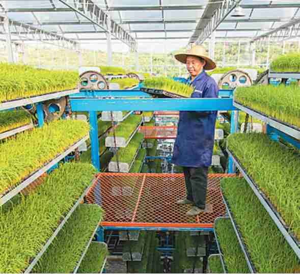 Agricultural technician Zhou Xiaomao checks the growth of rice seedlings in an automatic rice seedling center in Laoqiao town, Jishui county in Ji’an, east China’s Jiangxi province, April 12. (Photo by Luo Jianrong/People’s Daily Online)
