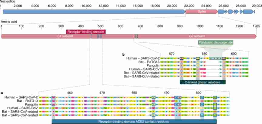 Our comparison of alpha- and betacoronaviruses identifies two notable genomic features of SARS-CoV-2: (i) on the basis of structural studiesand biochemical experiments, SARS-CoV-2 appears to be optimized for binding to the human receptor ACE2; and (ii) the spike protein of SARS-CoV-2 has a functional polybasic (furin) cleavage site at the S1–S2 boundary through the insertion of 12 nucleotides8, which additionally led to the predicted acquisition of three O-linked glycans around the site.