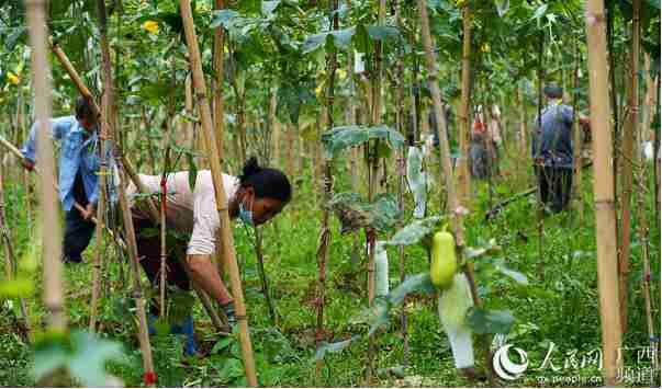 Villages work in fields of loofah gourds. (Photo courtesy of the Party organization department of Qinnan district)