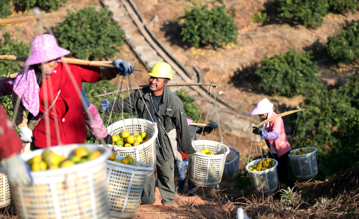 Farmers carry baskets of navel oranges in an orchard in Huichang, Jiangxi province, in 2019. Many locals have been lifted out of poverty by growing the fruit. [Photo by Chen Zebing/China Daily]