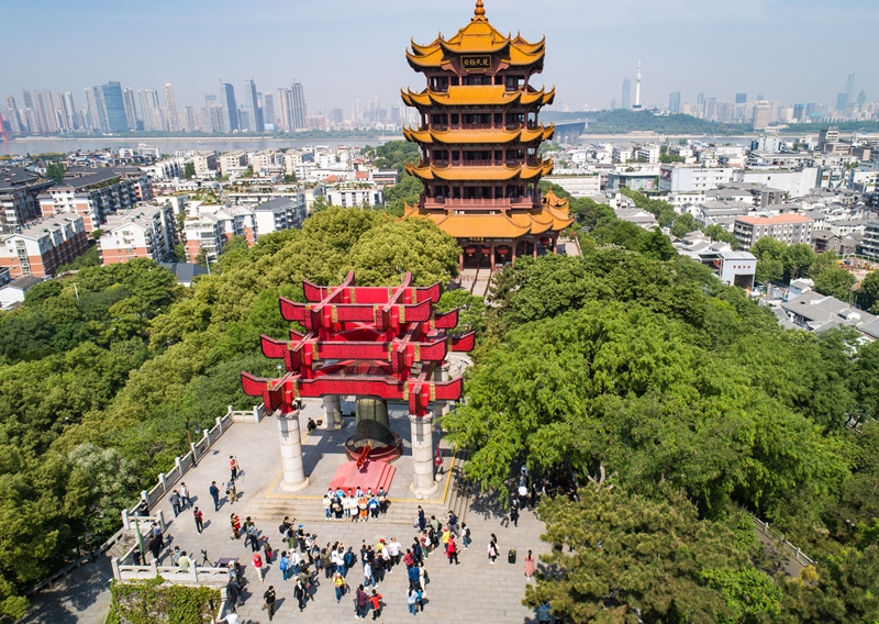 In this aerial photo taken on April 29, 2020, representatives of frontline health workers fighting COVID-19 attend a bell-ringing ceremony at the Yellow Crane Tower, or Huanghelou, a landmark in Wuhan, central China's Hubei Province. (Xinhua/Xiao Yijiu)