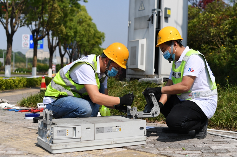 Workers work at the construction site of a 5G base station at Chongqing Hi-tech Zone in Chongqing, southwest China, April 15, 2020. (Xinhua/Wang Quanchao)