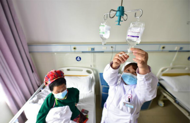 A medical worker takes care of a patient at a hospital in Danzhai County of Qiandongnan Miao and Dong Autonomous Prefecture, southwest China's Guizhou Province, May 1, 2020. People from various sectors stick to their posts during the Labor Day holiday. (Photo by Yang Wukui/Xinhua)