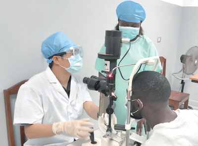 Zheng jinbiao, a member of the Chinese medical team to Equatorial Guinea, checks the eyesight of a local patient.(Photo via the Chinese medical team to Equatorial Guinea)