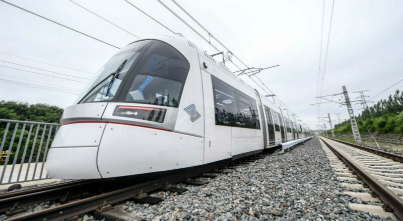 An explosion-proof light rail train undergoes a test in CRRC Changchun Railway Vehicles Co., Ltd. in Changchun, capital of northeast China's Jilin Province, July 25, 2019. The train, manufactured by CRRC Changchun Railway Vehicles Co., Ltd., will be used for the red line of the light rail system in the Israeli city of Tel Aviv. (Xinhua/Wang Haofei)