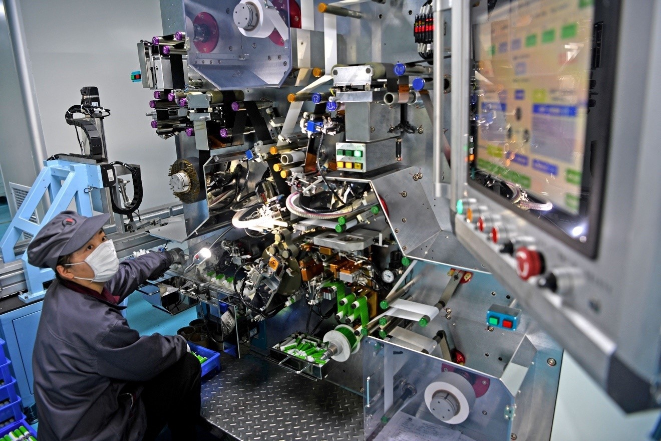 An employee of a new energy enterprise in Huainan, east China’s Anhui province manufactures cells of lithium-ion batteries, on April 23, 2020. (Photo by Chen Bin/People’s Daily Online)
