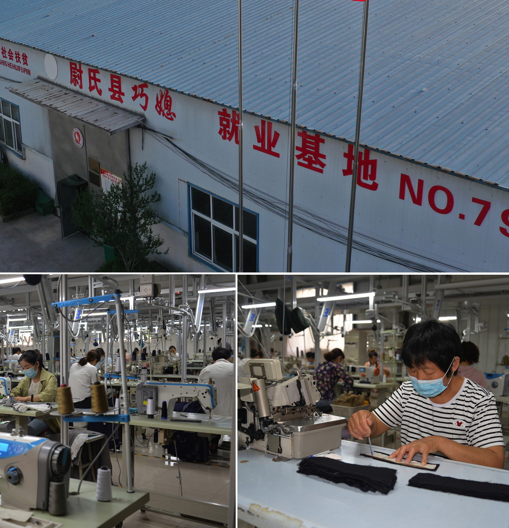 The upper part of this combo photo taken on May 16, 2020 shows the outdoor scene of an employment center providing jobs for left-behind women in rural areas in Zhouzhuang village, Daqiao township, Weishi county of Kaifeng, central China’s Henan province. The lower part of this photo taken on the same day shows employees working to meet orders (L), as well as Wang Jinrong, a 56-year-old villager, who is busy at her job at the center.