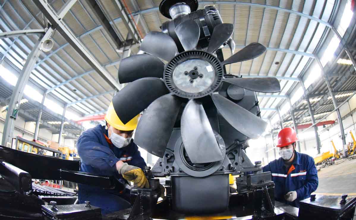 Workers assemble an industrial turbine at a factory in the Haizhou Economic Development Zone in Lianyungang, Jiangsu province, in May. GENG YUHE/FOR CHINA DAILY
