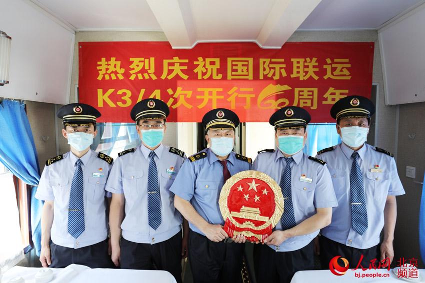 Crew members of the K3/4 train pose for a group photo in a carriage. (Photo/Yin Xingyun)