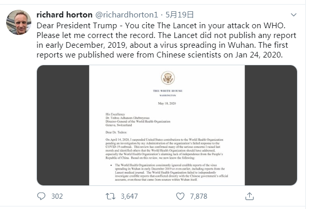 Richard Horton, the Lancet’s editor-in-chief, noted in a Tuesday tweet: “Dear President Trump - You cite The Lancet in your attack on WHO. Please let me correct the record. The Lancet did not publish any report in early December 2019, about a virus spreading in Wuhan. The first reports we published were from Chinese scientists on Jan. 24, 2020.”