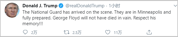 A screengrab from U.S. President Donald Trump's Twitter account on May 29, 2020, shows that he tweeted "George Floyd will not have died in vain. Respect his memory!!!" (Xinhua)