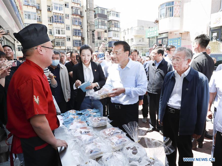 Chinese Premier Li Keqiang, also a member of the Standing Committee of the Political Bureau of the Communist Party of China Central Committee, talks with a stallholder in front of a grocery store on the Dongyuan Street in Yantai, east China's Shandong Province, June 1, 2020. Li made an inspection tour of Shandong Province from Monday to Tuesday. (Xinhua/Pang Xinglei)