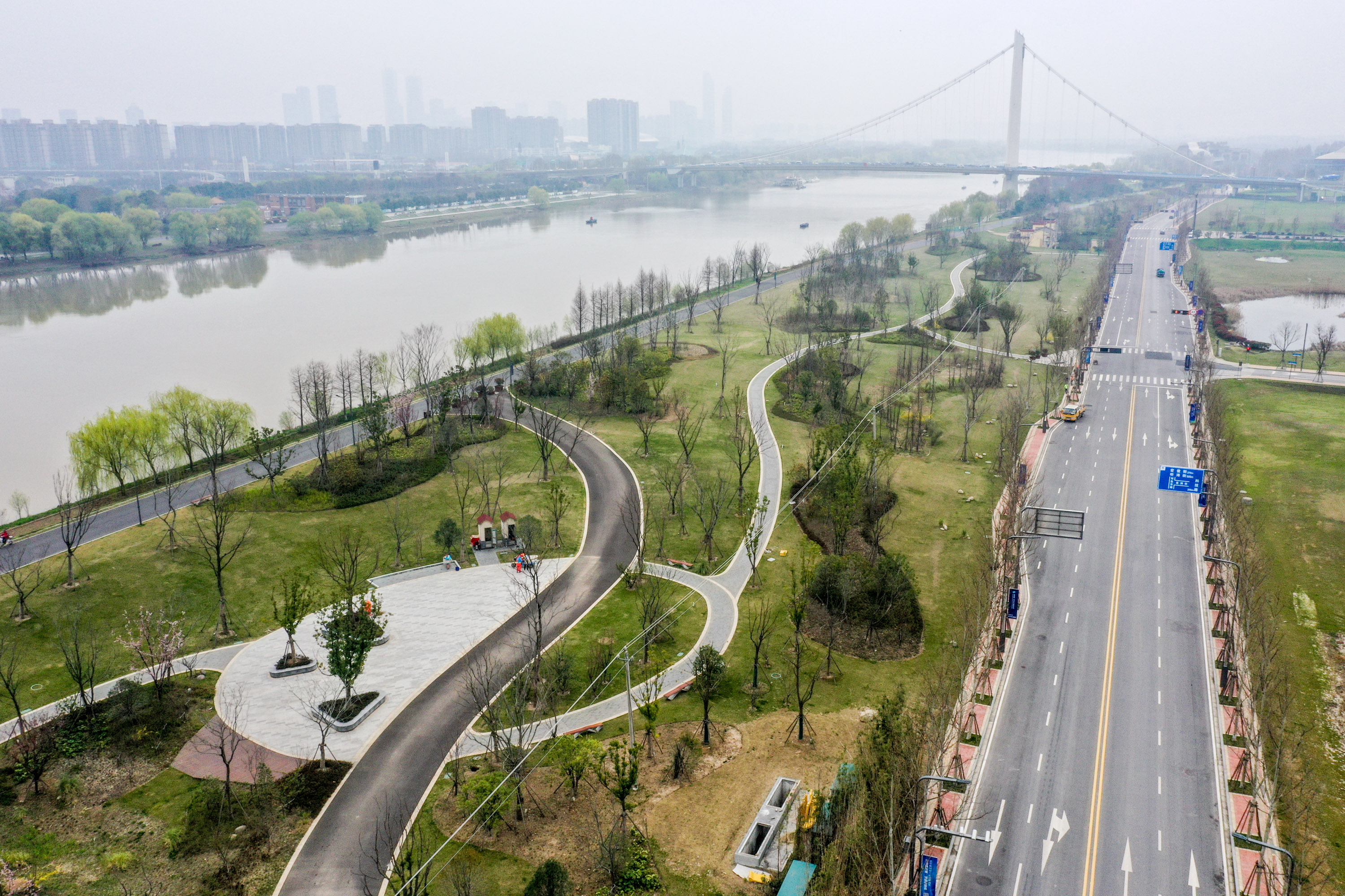 Aerial photo taken on March 18, 2019 shows an eco-park on Jiangxinzhou islet of the Yangtze River in Nanjing, east China's Jiangsu Province. (Xinhua/Li Bo)