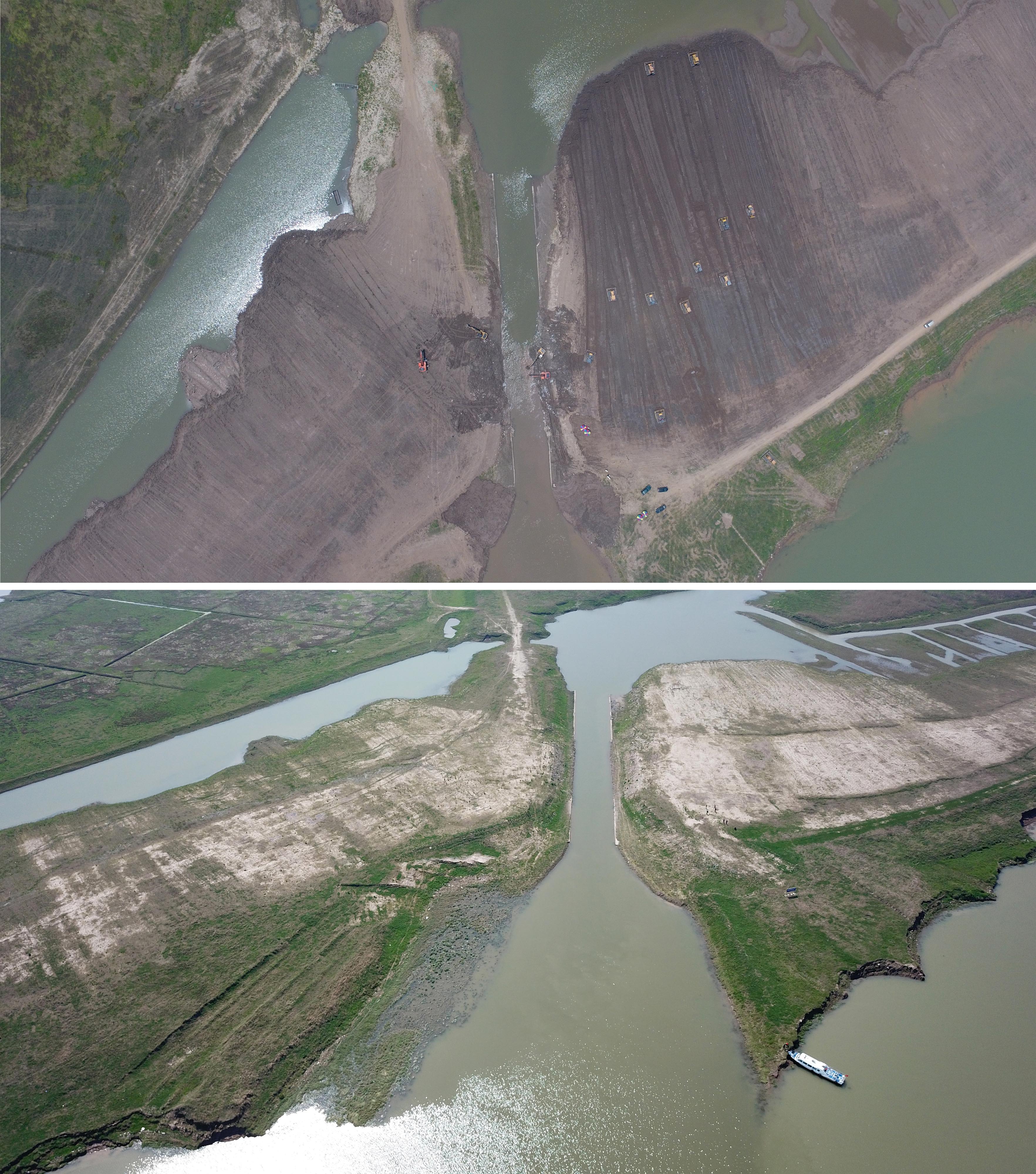 Combo photo shows engineering machinery creating a sluiceway after dismantling illegal fences on a shoal in the Dongting Lake in central China's Hunan Province (top, aerial photo taken on June 15, 2018 by Ding Chunyu), and the same sluiceway after its completion (bottom, aerial photo taken on March 12, 2019 by Chen Zeguo).