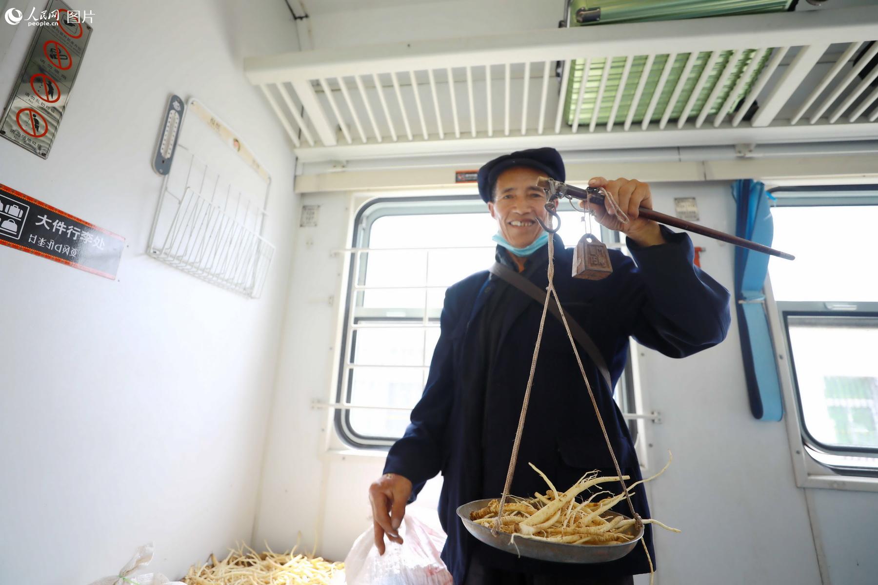A passenger displays recently purchased codonopsis pilosula in the baggage area of Train No. 5633 on May 21. (Photo/Li Kai)